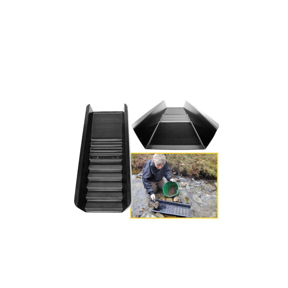 La Mini Sluice es una versión mucho menos voluminosa y más fácilmente transportable de las Classic y Super sluices de Caledonian. Es la más pequeña de las esclusas Caledonian. Está dirigida a aquellos que desean recorrer largas distancias en prospección mientras disponen de un sluice eficiente. Es fácil de instalar y usar. Cuando se alimenta con agua y gravas auríferas, mostrará instantáneamente el oro fino en la alfombra estriada al frente y el resto del oro quedará perfectamente atrapado en los riffles siguientes.
