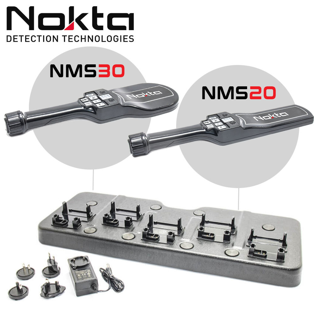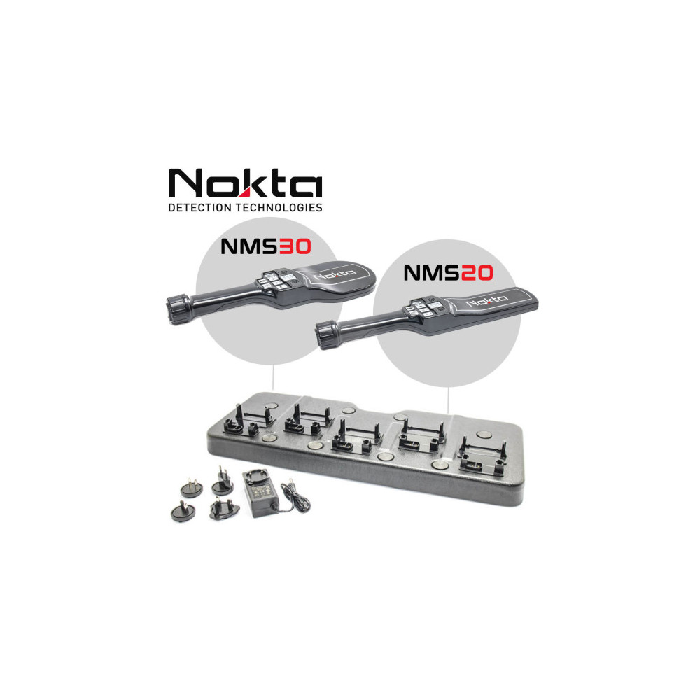 El Multidock de carga permite cargar simultáneamente 5 detectores de seguridad NMS20 o NMS30. Así, ganarás en facilidad y tiempo de carga. El Multidock se entrega con el cargador y los adaptadores de corriente universales para poder cargar en cualquier país. Los NMS20 y NMS30 no están incluidos en el Multidock y se venden por separado.