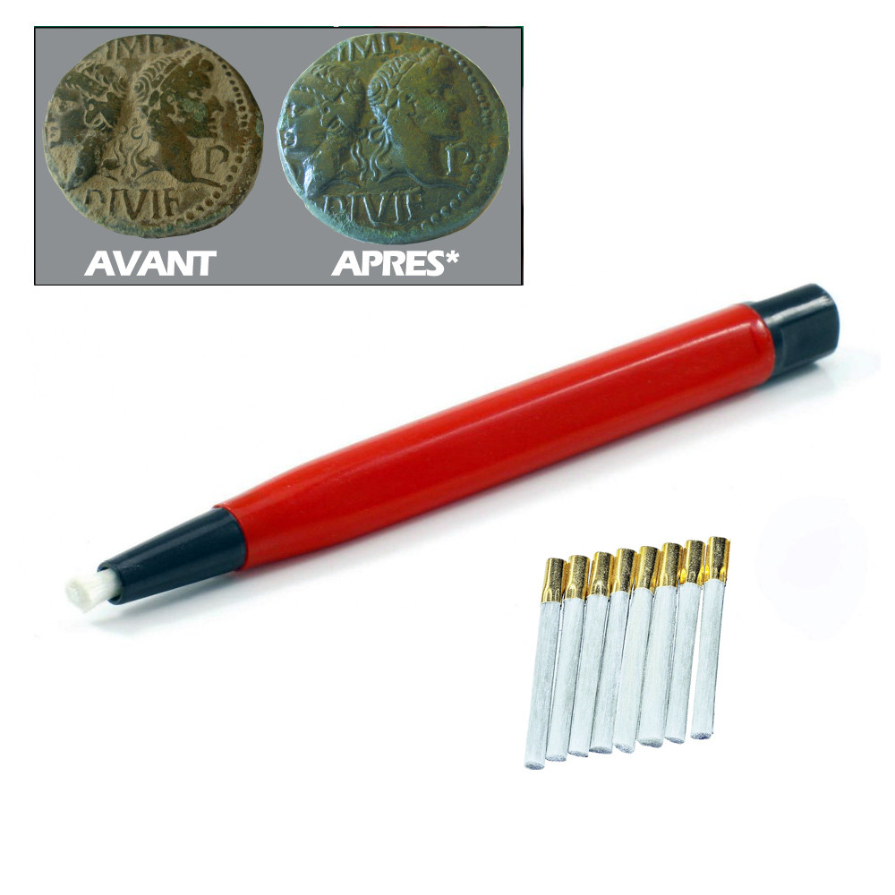El lapiz de fibra de vidrio es el accesorio indispensable para limpiar monedas y otros objetos sin dañar la pátina. Viene con 8 recargas de fibra de vidrio.