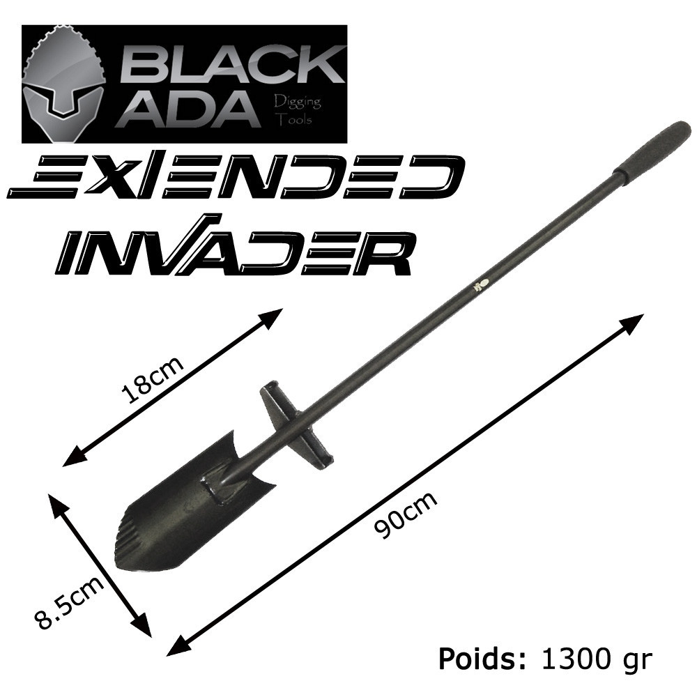 La pala INVADER es una de las más populares del fabricante británico Black Ada. Cuenta con un reposapiés ancho, ideal para cavar. Esta versión «Extended Invader» tiene una longitud total de 90 cm, frente a los 67 cm de la Invader original. La anchura de la pala es de 8,5 cm (13 cm por el reposapiés). Pesa 1,3 kg. 48