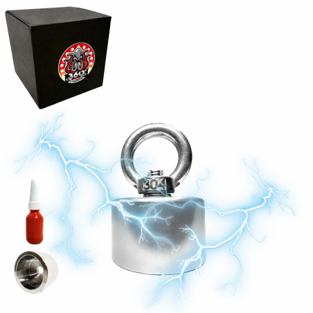 El Fouilleur ofrece una gama completa de imanes de Neodimio de alta calidad con anillo de elevación integrado en acero inoxidable. Los imanes de Neodimio son los imanes permanentes más comunes y potentes del mundo. Nuestros imanes son del tipo en potes, ya que están rodeados por un recipiente de acero. Este dispositivo tiene el efecto de concentrar el campo magnético y aumentar la fuerza de adherencia del imán hacia la parte inferior del recipiente. Por lo tanto, son particularmente adecuados para la búsqueda en pozos o en cursos de agua. El neodimio reacciona con el oxígeno. Cuando no está tratado, se oxida muy rápidamente. Por eso, todos los imanes de neodimio de El Fouilleur están provistos de una capa protectora. Esta es tan fina que el tipo de recubrimiento no influye en la fuerza de adherencia del imán. Utilizamos un tratamiento triple de Níquel (Ni-Cu-Ni) de 12 micrómetros para protegerlo. A diferencia de otras marcas que presumen de fuerzas de elevación/adherencia fantasiosas, garantizamos el rendimiento anunciado. Sin embargo, el grosor del objeto levantado, la superficie de contacto, el contenido de hierro del objeto y su orientación pueden influir en gran medida en esta fuerza teórica de elevación. Así, cuanto más grueso sea el objeto, más se levante verticalmente, mayor será la superficie de contacto, mayor será su contenido de hierro y mayores serán sus posibilidades de recuperar un objeto cuyo peso se acerque al peso máximo de elevación anunciado.