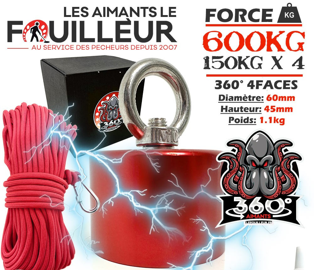 Este imán 360° permite comenzar bien sin arruinarse. Atrae por todas las caras y permite levantar hasta 600 kg (aproximadamente 150 kg por cara). A diferencia de otros imanes 360° en el mercado, la carcasa de protección reforzada de 4 mm está incluida. Además de la carcasa, este imán está protegido por un triple tratamiento de Níquel (Ni-Cu-Ni) de 12 micrómetros para garantizarle una vida útil óptima. Peso 1.1 kg. Dimensiones 65x45mm. Freno de rosca/collarin para anillo de sujeción incluido. Cuerda incluida