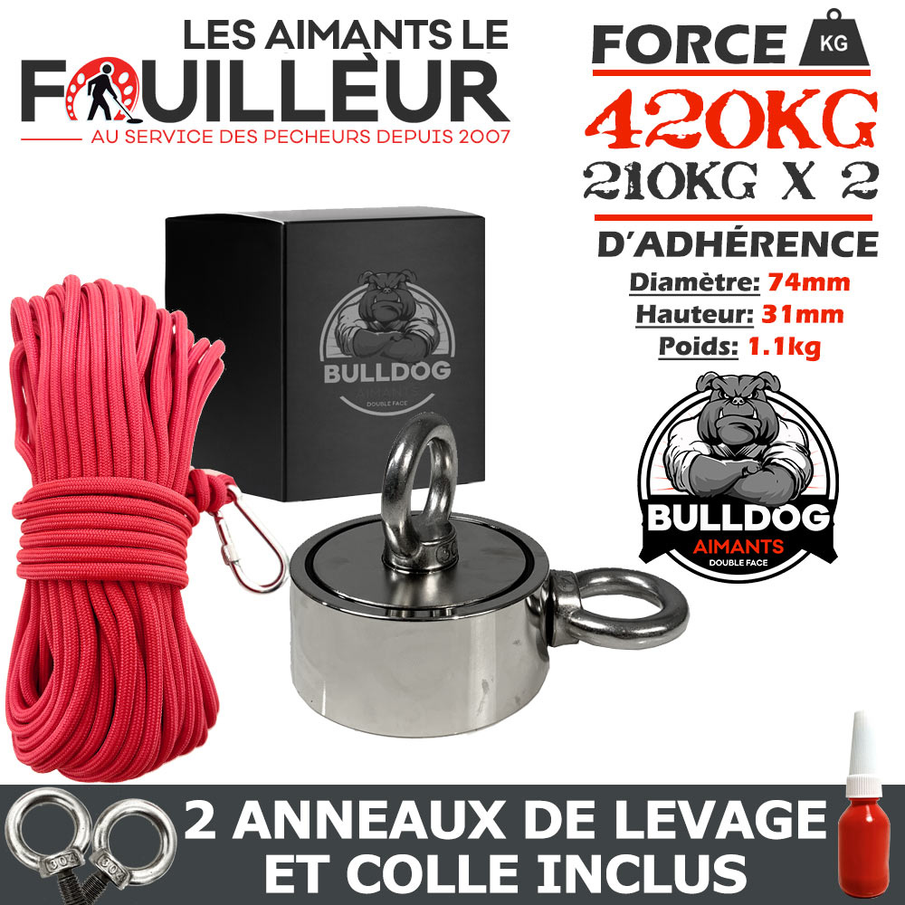 Este imán de doble cara tipo Bulldog es particularmente adecuado para la búsqueda en pozos o en ríos, ya que atrapa los objetivos metálicos de cada lado. ¡Permite levantar 210 kg de cada lado! Peso 1050 gramos. Imán protegido por un triple tratamiento de Níquel (Ni-Cu-Ni) de 12 micrómetros para garantizarle una vida útil óptima. Botella de pegamento extrafuerte para bloquear cada anillo