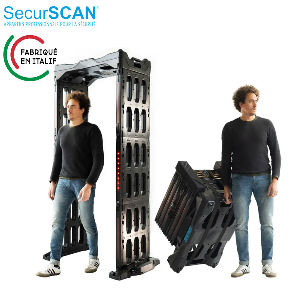 El pórtico de seguridad SecurSCAN S-MOBILE es la solución para un control de seguridad móvil de las personas durante sus eventos. El SMOBILE está fabricado en Italia, se instala y se desmonta en 5 minutos. También es muy fácilmente transportable gracias a su carrito integrado. Es robusto gracias a su estructura de Acrilonitrilo Butadieno Estireno de alta resistencia. Movilidad y robustez lo convierten en la solución de seguridad perfecta para sus eventos de gran afluencia, como conciertos o manifestaciones deportivas. Detecta en 6 zonas según 300 niveles de sensibilidad y pesa 47 kg. Autonomía de las baterías: 20h.