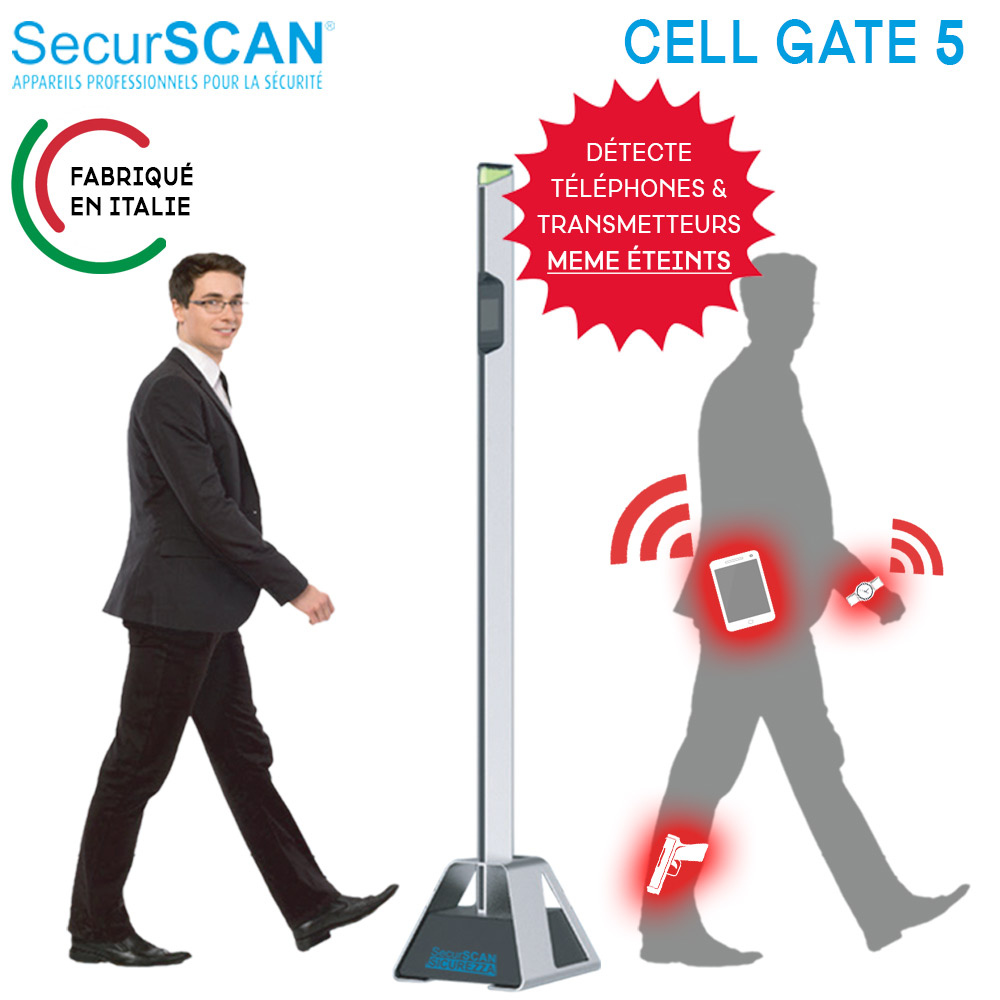 El SecurSCAN CellGate 5 fabricado en Italia permite detectar teléfonos móviles así como cualquier tipo de emisor, incluso apagado. También le alerta sobre la presencia de objetos metálicos de tamaño medio como las pistolas. A diferencia de los modelos de mano, el CellGate permite un paso muy rápido de hasta 50 personas por minuto, pero sobre todo una detección de un destornillador o un smartphone hasta una distancia de 120 cm. Con 100 niveles de sensibilidad, puede localizar microteléfonos móviles incluso apagados con precisión en 5 zonas a través de un LED que le indica dónde se encuentra el objeto. Es adecuado para prisiones, tribunales y centros de exámenes. Cumpliendo con la norma IPX5, puede ser utilizado en exteriores. Ligero, solo pesa 16 kg. Dimensiones 196x360x380 mm.